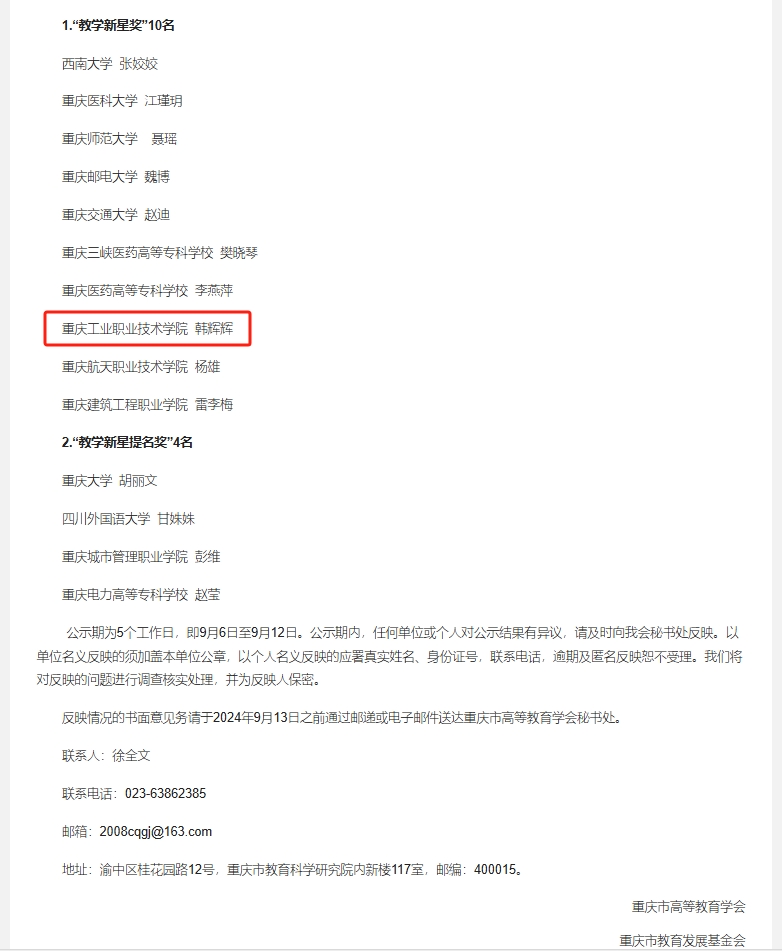 日前,学校荣获重庆市高等教育学会评选的第三届“新时代普通高校优秀教务处”荣誉称号,电气工程学院教师郭艳萍荣获2024年度“教书育人奖”荣誉称号,机械工程学院教师韩辉辉荣获“教学新星奖”荣誉称号。学校将坚持立德树人根本任务,进一步深化教育教学改革,加强师资队伍建设,提高人才培养质量,纵深推动学校高质量发展。