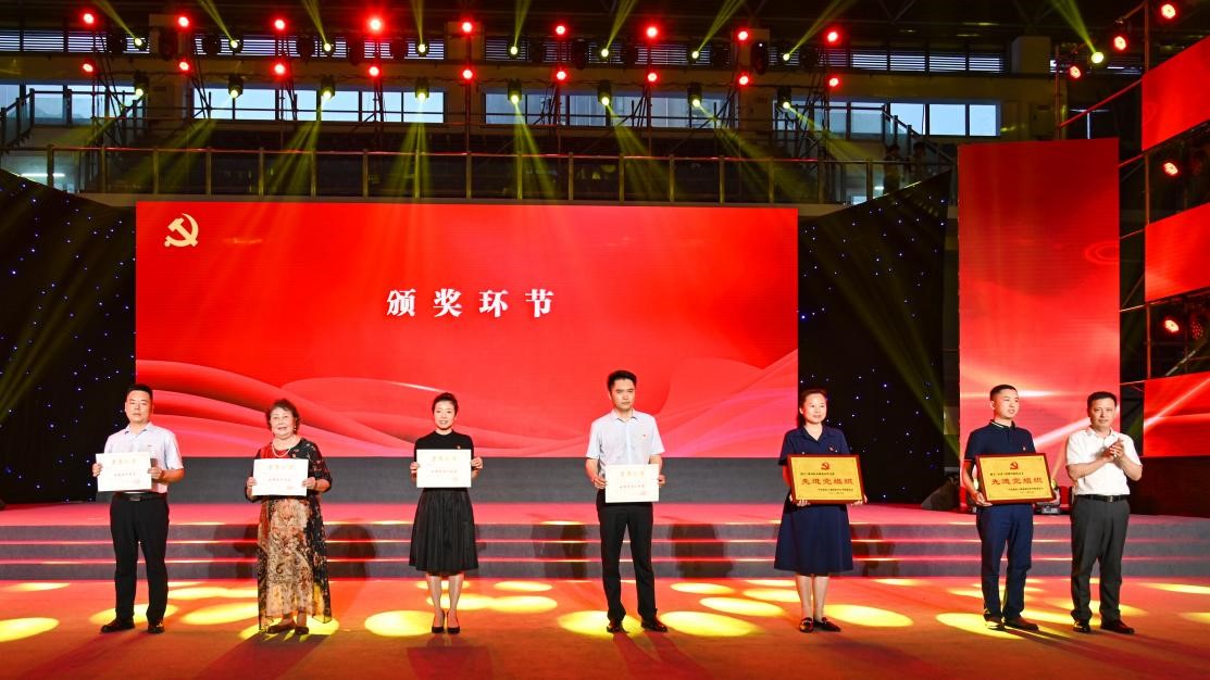 学校党委书记郭天平为先进党组织、优秀共产党员、优秀党务工作者代表颁发证书和奖牌