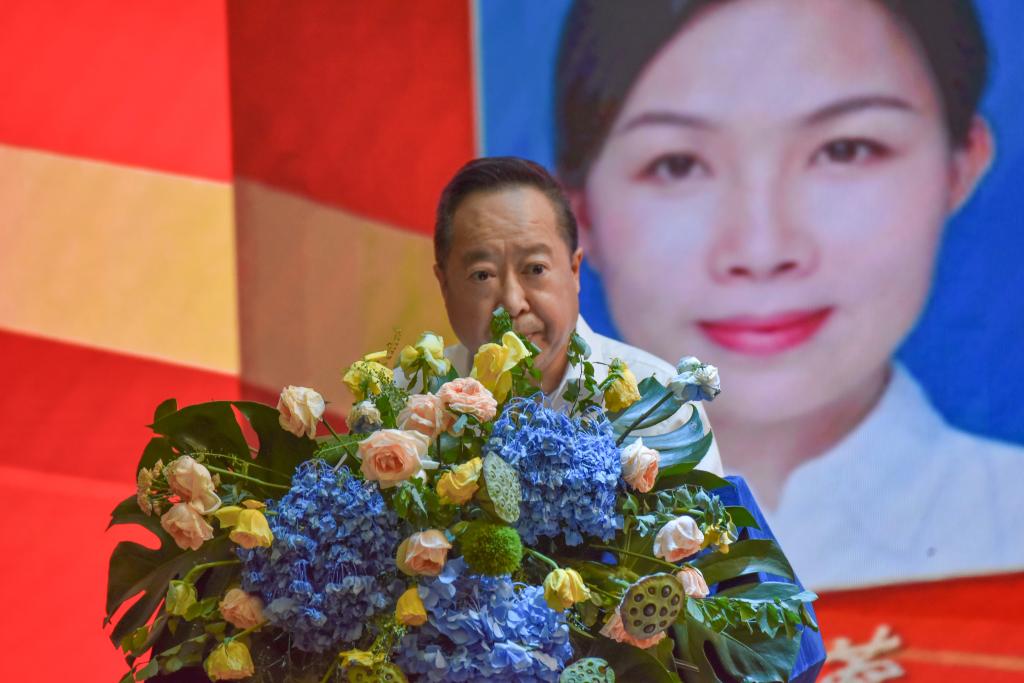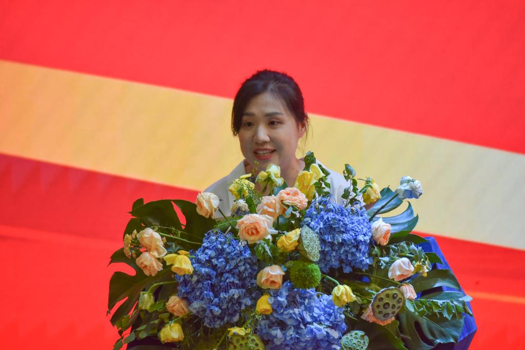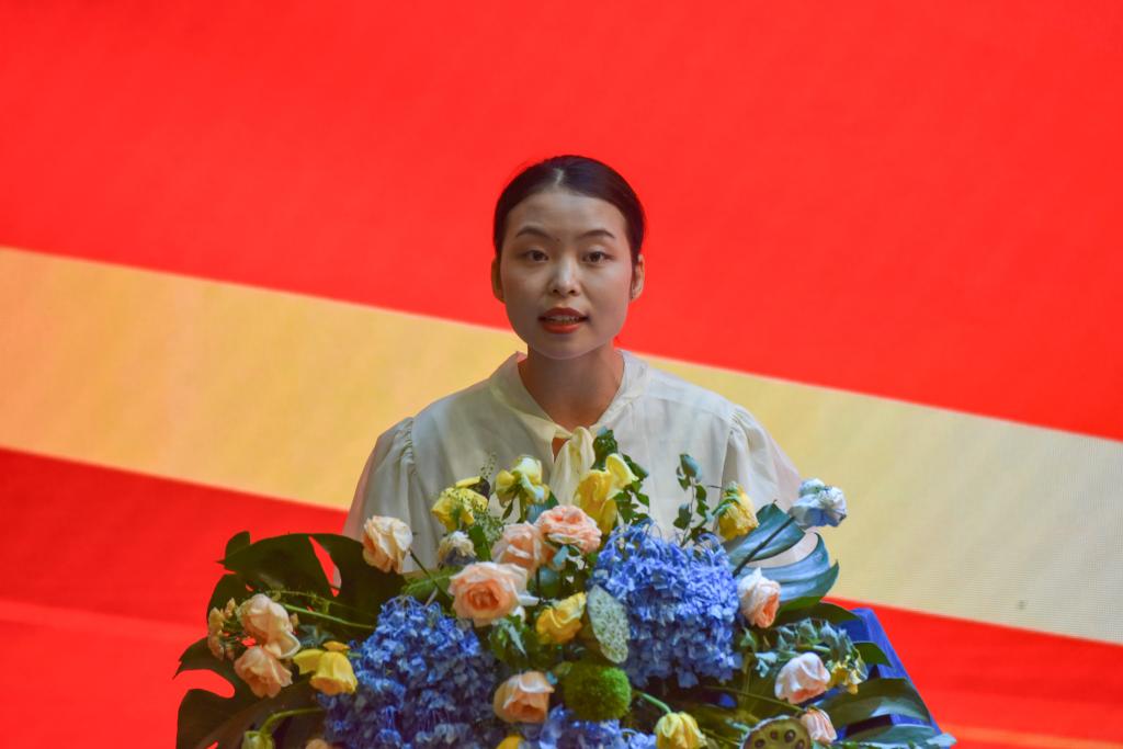 图为游敏作为学生代表向全体教师送上节日祝福,她表示,将时刻铭记师恩,在未来学习道路上,继续刻苦学习不断突破自己,努力成为新时代接班人