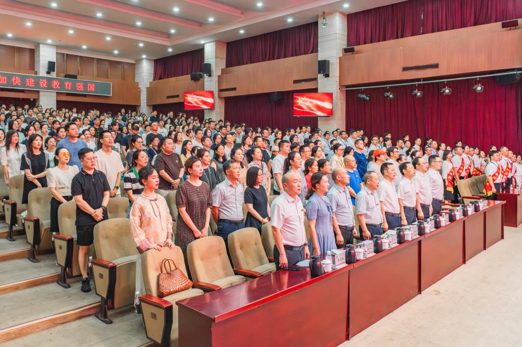 郭天平对全校教职工提出三点期望,一是坚守热爱。新时代的教师或教育工作者要有对所从事的工作的执着热爱,把自己的温暖和情感倾注到每一个学生身上,以真情、真心、真诚感人化人树人,坚持爱教育、爱事业、爱学生,让每一个学生都健康成长。二是深耕笃行。每一位教师或教育工作者都要秉持勤学笃行、求是创新的躬耕态度,不断提升道德品格、专业素养和教书育人能力,在学习中长知识,在实践中增智慧,努力成为为学、为事、为人都堪称表率的新时代“大先生”!三是甘于奉献。广大教师和教育工作者要心有学生、敬业爱岗,要以赤诚之心、奉献之心、仁爱之心投身教育事业,躬耕教坛、默默奉献,担起立德树人根本任务,以育人为一生志业,以实际行动诠释高尚师德。