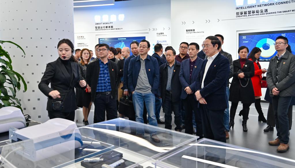 在重庆市数字经济发展展示中心,全体党员干部通过观看宣传片认真学习了习近平总书记关于数字经济的重要论述以及对重庆提出的“两点”定位、“两地”“两高”目标、发挥“三个作用”和营造良好政治生态的重要指示要求。通过聆听讲解、互动体验和参观了解包括阿里云、腾讯和猪八戒网等十余家智能化发展代表企业的展台产品,从全球视野、国家战略、重庆定位三个层面,全面了解了重庆推动大数据智能化发展的背景、机遇和途径。