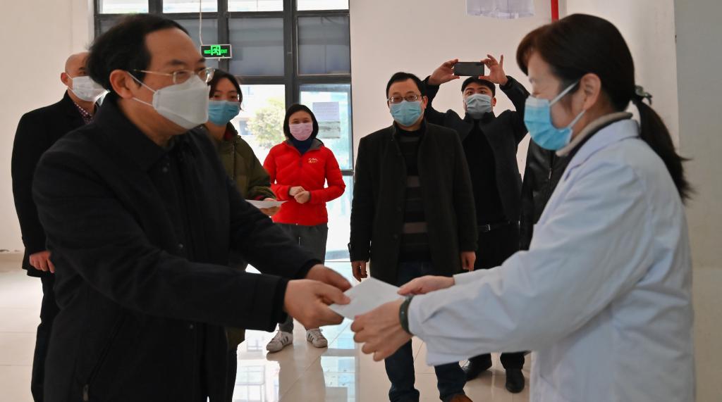慰问中,王官成书记先后前往学校各岗亭处、值班室、卫生所、丁香水榭家属区体温检测点等处,看望慰问一直坚守岗位的医务人员、摸排值守人员、一线干部代表、后勤保障人员等抗疫一线工作人员,为他们送去慰问金。