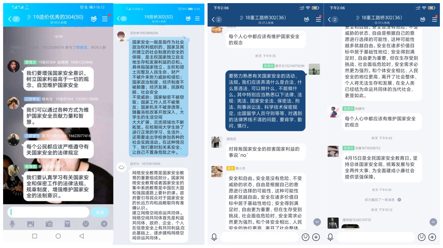 建筑工程学院师生以“坚持总体国家安全观,统筹传统安全和非传统安全,为决胜全面建成小康社会提供坚强保障”为主题,深刻剖析了国家安全是国家发展的最重要基石、人民福祉的最根本保障,认识到学习国家安全教育法律法规的迫切性和重要性,纷纷表示要做一名国家安全卫士,为构筑国家安全防线贡献大学生的一份力量。机械工程与自动化学院以“加强宣传教育,凝聚共识力量”为主题,开展线上班会交流学习心得。19机制类308班沈杨同学认为,社会在进步,时代在发展,国家安全问题已经不局限于国家的军事问题,网络安全的重要性也日渐显现。作为新时代大学生,管理好个人言行,维护好网络生态环境安全,是我们对国家安全应做的贡献;19机制类311班田茂江同学表示,国家安全是人民追求幸福的基础,只有懂得维护国家安全,我们的国家和民族才能长治久安;19机制类310班廖秀靖同学说道,我们应当担负起维护国家安全的责任,不做危害国家安全的任何行为,国家安全是重中之重,国家安全我们才有安全;18电气302班李金鹏同学说道,国家安全关系到整个国家和民族的生死存亡,我们要始终树立国家利益高于一切的观念,维护国家安全既是国家利益的需要,又是个人安全的需要;18机制专本301班陈卓同学认为,我们要懂得如何维护国家安全,面对贩卖国家科技、重大经济政策等涉密文件时,牢记12339举报电话,及时举报揭发;17机器人302班王淦同学表示,作为新时代大学生,要树立安全意识、风险意识、防范意识、科学意识和守法意识;熟悉安全知识,了解生活安全、公共安全以及自然灾害等方面的安全知识;掌握安全技能,掌握现代社会中安全生活和生产的基本技能等。