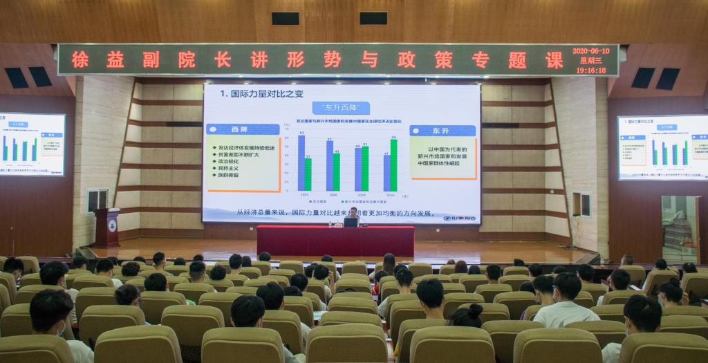 徐益副院长从“深刻认识百年未有之大变局”“大变局中机遇与挑战同生共存”“大变局中的中国角色”三个方面向同学们阐释了当今世界的形势和格局。他讲到,疫情的暴发使全世界重新认识和定义了中国,“中国制度”和“中国速度”令世界震惊。他从“国际力量对比之变”“世界格局之变”“科技革命之变”等方面让同学们更为深刻地了解世界、了解中国。徐益副院长勉励同学们,要切实增强“四个意识”,坚定“四个自信”,做到“两个维护”,要大力弘扬以爱国主义为核心的民族精神和以改革创新为核心的时代精神,要为解决人类问题贡献中国智慧和中国方案,实现中华民族的伟大复兴。