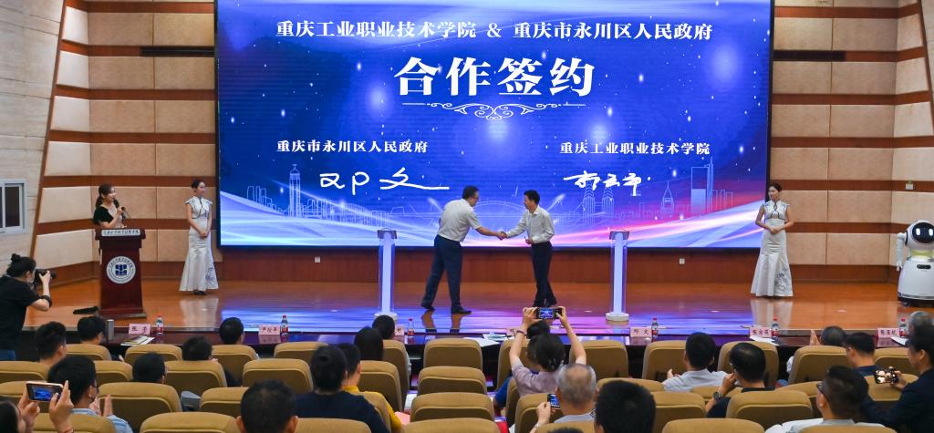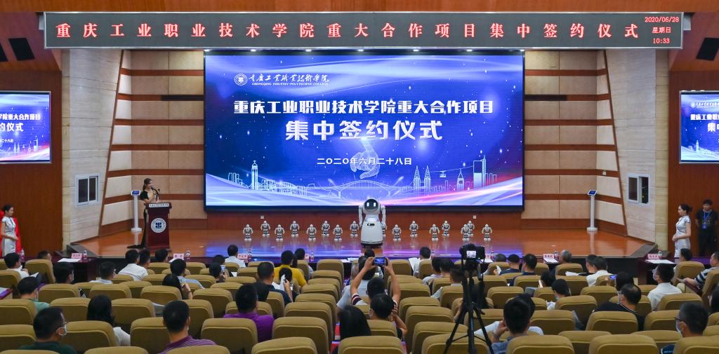 6月28日,重庆工业职业技术学院重大合作项目集中签约暨揭牌仪式在学校第一学术报告厅成功举行。市委教育工委委员、市教育委员会副主任邓沁泉,市经济和信息化委员会二级巡视员潘成彬,永川区委常委、区新城建管委党工委书记邓文,市高教学会执行会长、秘书长严欣平,市高教学会首席专家张宗荫,国家督学、市教育学会会长张荣,国家督学、市高职教育研究会会长张亚杭以及相关负责同志;重庆仙桃数据谷投资管理有限公司董事长汪小平等15家企业高级管理人员及代表;重庆工业职业技术学院院长郭天平,副院长徐益、徐兴旺、纪委书记谢涛、副院长赵柏森出席本次签约活动。学校各二级学院及职能部门负责人等参加活动。