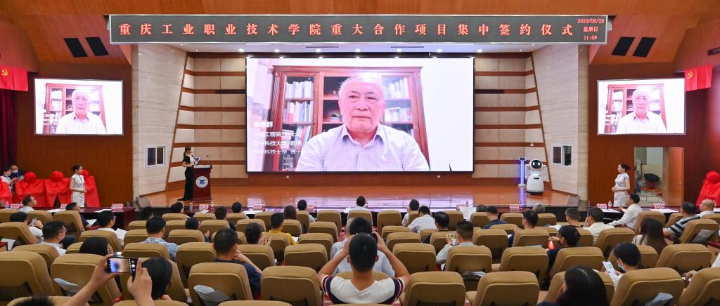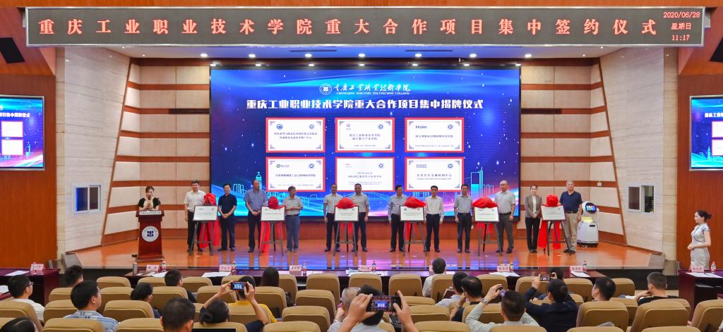 集中签约和揭牌仪式上,学校分别与永川区人民政府、重庆华龙网文化实业公司、青岛海尔智能家电科技有限公司、宜科(天津)电子有限公司、洲际酒店集团、深圳市优必选科技股份有限公司、北京新大陆时代教育科技有限公司、中移物联网有限公司、北京络捷斯特科技发展股份有限公司、四川一凯工程科技有限公司等单位现场签约;与相关合作单位共同为华中科技大学材料成型与模具技术国家重点实验室-西南模具先进技术推广中心、重庆工业职业技术学院-两江数字产业学院、海尔智能家居物联网培训学院、宜科智能制造工业互联网培训学院、洲际酒店集团英才培养学院、长安汽车全球培训中心揭牌。中国工程院院士、华中科技大学教授、博士生导师李德群,洲际酒店集团首席人力资源总监屈耀新分别通过视频致辞,为与学校实现合作共建表示热烈祝贺。学校聚焦服务重庆向“智能制造”重镇建设转型、数字经济产业高质量发展和“成渝双城经济圈”建设等重大发展战略需要,立足学校骨干专业群特色与优势开展合作,将人才链、产业链和创新链深度对接,做出新时代提升校企合作水平的有益探索。