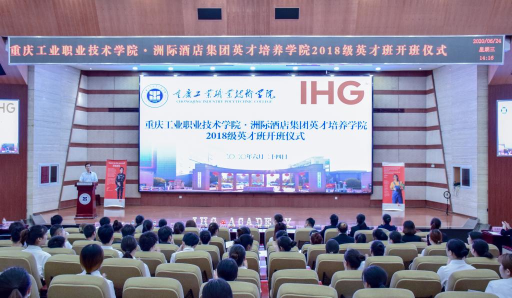 日前,学校洲际酒店集团英才培养学院2018级英才班开班仪式在学校第一学术报告厅举行。重庆保利花园皇冠假日酒店总经理闵成勇,重庆解放碑皇冠假日酒店人力资源经理刘艳丽,重庆富力假日酒店人力资源经理方照棹,以及重庆长都假日酒店、重庆丽晶酒店、成都机场假日酒店、内江滨江假日酒店共7家企业高级管理人员及代表;学校副院长赵柏森出席开班仪式,学校经济与管理学院院长金渝琳、党总支书记周庆以及相关工作负责人,教师代表和2018级、2019级全体酒店管理专业学生参加开班仪式。开班仪式由副院长麻红晓主持。