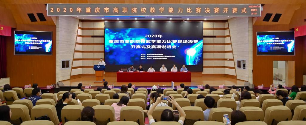 9月16日,由我校承办的2020年重庆市高职院校教学能力比赛现场决赛开赛式及赛项说明会在学校第一学术报告厅召开。市教育委员会高教处副处长吴岚,市高等职业技术教育研究会理事长张亚杭,我校党委书记王官成,评委代表李宗义,重庆财经职业技术学院院长曹毅,市教育委员会相关负责同志等出席仪式。来自全市的49支参赛团队的老师、评委、领队代表以及新闻媒体人士等共200余人参加仪式。重庆市高等职业技术教育研究会秘书长、我校副院长赵柏森主持仪式。