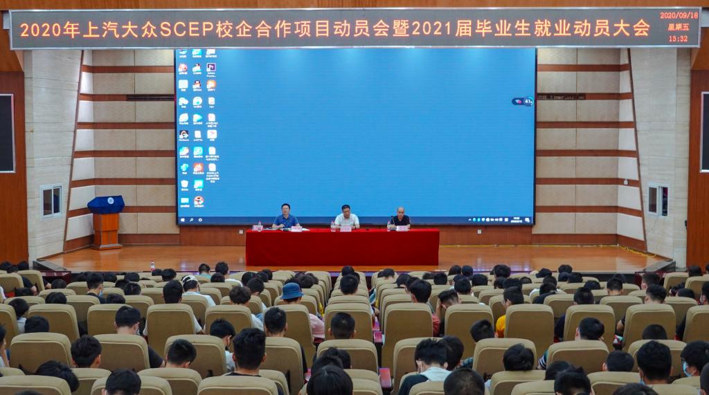 日前,学校车辆工程学院在第一报告厅开展2020年上汽大众SCEP校企合作项目动员会暨2021届毕业生就业动员大会。院长李雷、党总支副书记谭力,二级学院校企合作负责人程飞、重庆轻舟汽车销售服务有限公司总经理李进军参加动员会,2018级全体学生聆听动员会。