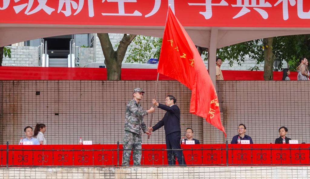 王官成书记向军训团授军训团团旗,吴成振参谋接旗。另外,教师代表冯晖博士、高年级学生代表王瑜洛、新生代表刘吉华、军训教官代表杨贵武也在会上先后作了发言。开学典礼暨军事训练动员大会后,2020级新生军训正式开始。