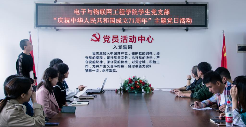 日前,学校电子与物联网工程学院学生党支部开展了“庆祝中华人民共和国成立71周年”主题党日活动,学院党总支书记周红霞以及全体教师党员、学生党员、入党积极分子参加活动。