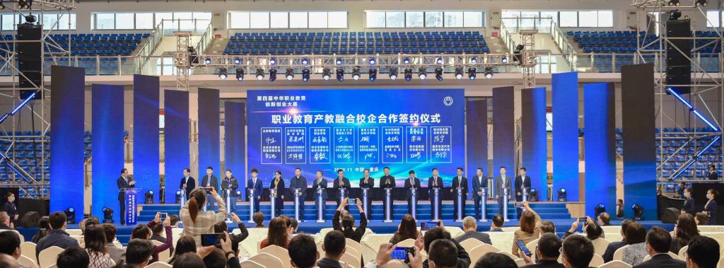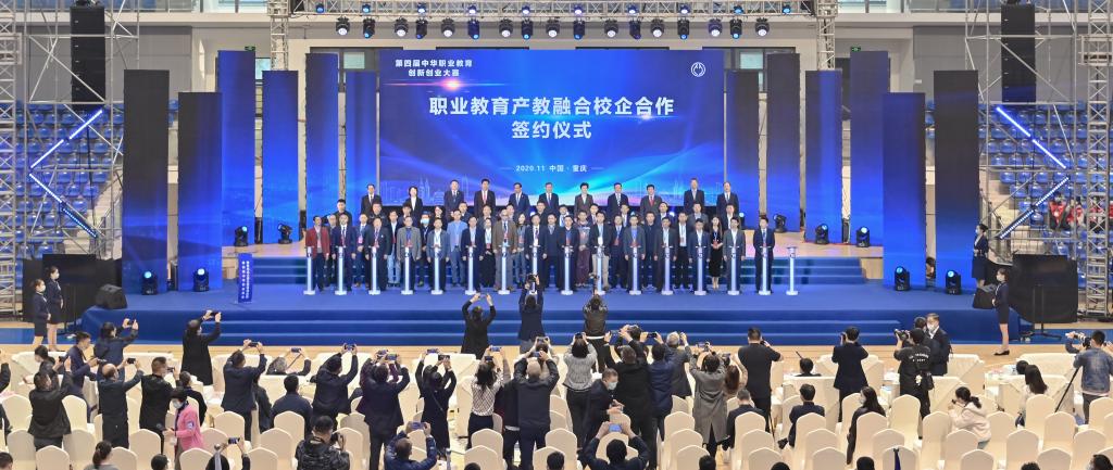 11月17日,全国职业教育产教融合校企合作签约仪式在重庆工业职业技术学院体育馆举行。全国人大常委会副委员长、中华职业教育社理事长郝明金,重庆市委常委、市委统战部部长李静,重庆市人民政府副市长屈谦,中华职业教育社副理事长苏华,中华职业教育社党组书记、总干事方乃纯,重庆市委统战部常务副部长王庆,重庆市委教育工委书记、市教委主任黄政,中华职业教育社副总干事李英爱,渝北区委书记唐川,重庆工业职业技术学院党委书记王官成等人出席签约仪式。重庆市人大常委会副主任、市中华职业教育社主任沈金强主持仪式。