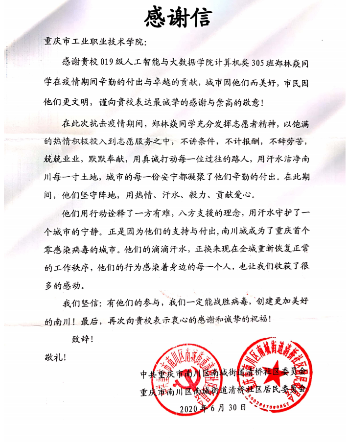 学校人工智能与大数据学院学生郑林焱在新冠肺炎疫情爆发时期主动前往市南川区南城街道清桥社区进行疫情防控志愿服务。日前,市南川区南城街道清桥社区居民委员会向郑林焱同学送来了感谢信。信中讲到,郑林焱同学在工作中无私奉献、兢兢业业,用实际行动助力社区疫情防控。他的行为不仅展现了新时代青年大学生责任担当精神,更为我校学子树立了优秀榜样。