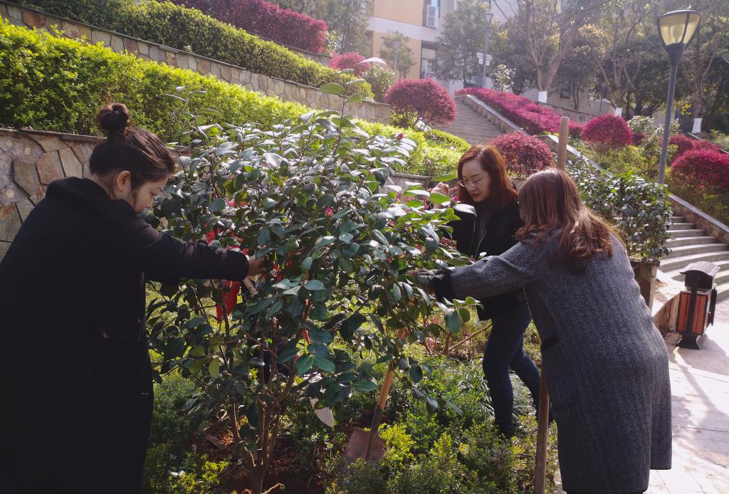党员同志们将部分零散分布在校园角落里生长受阻的茶花移挖出来,栽种到镜湖孔子塑像周边的花台里,打造出一道亮丽的茶花带。大家拿起铁锹和锄头,挖坑、扶苗、培土、浇水,一个个干劲十足,配合默契。大家一边植树一边交流,要自觉树立关爱自然、善待环境、节约资源的发展理念,增强全民植绿、护绿、爱绿、兴绿的生态文明意识,积极为建设绿色、美丽校园尽一已之力。