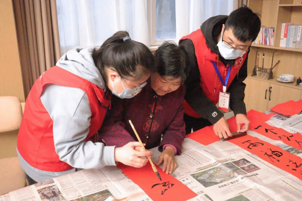 活动中,志愿者们围坐在老党员们周围,倾听他们讲述红色故事,回顾当年的艰苦岁月和党的光辉历程。志愿者们用铿锵有力的声音朗诵了毛泽东的《七律·长征》,并与养老服务中心的爷爷奶奶一起为祖国书写祝福。响亮的声音仿佛再现了万里长征的艰难历程,红纸墨笔仿佛是时代掀开新的历史篇章,一笔一画勾勒着对党的最美好祝愿。