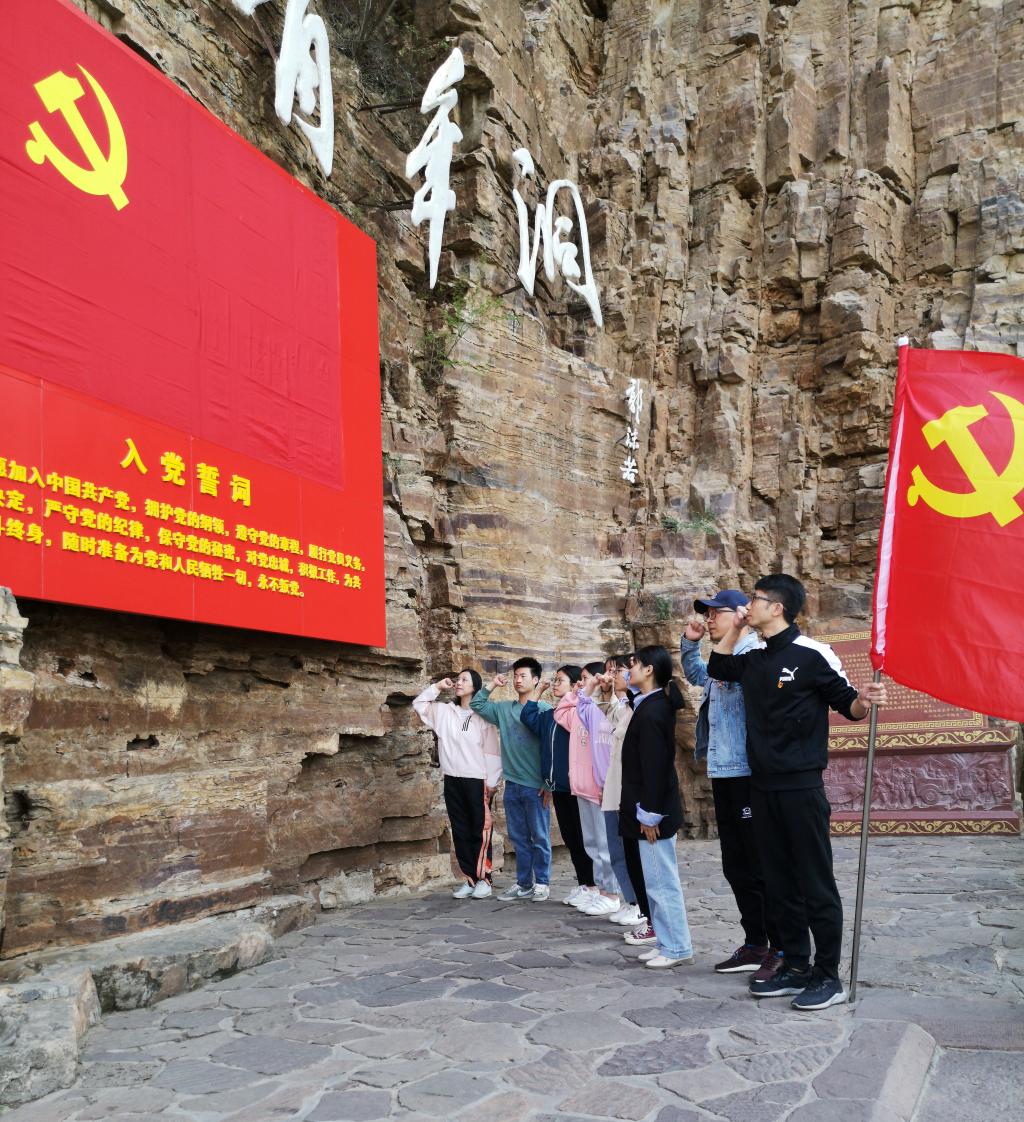 师生党员在红旗渠青年洞前重温入党誓词