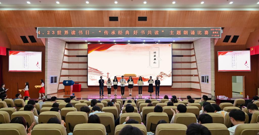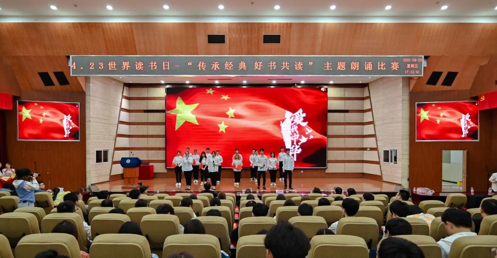 学生代表向大家介绍了“世界读书日”的相关背景,并向全校同学发出“传承经典,好书共读”的倡议。“传承经典,好书共读”朗诵比赛是本次系列活动的重头戏,参赛选手们依次登台朗诵,他们的激情投入,将观众带入时而蓬勃飞扬、时而凝神思考的意境中。学校图书管理委员会干事为大家分享了“好书推荐卡”标签活动中选出的佳句。图管会干事们表演了合诵节目《中国,中国》,抒发了青年大学生炽热的爱国之情。