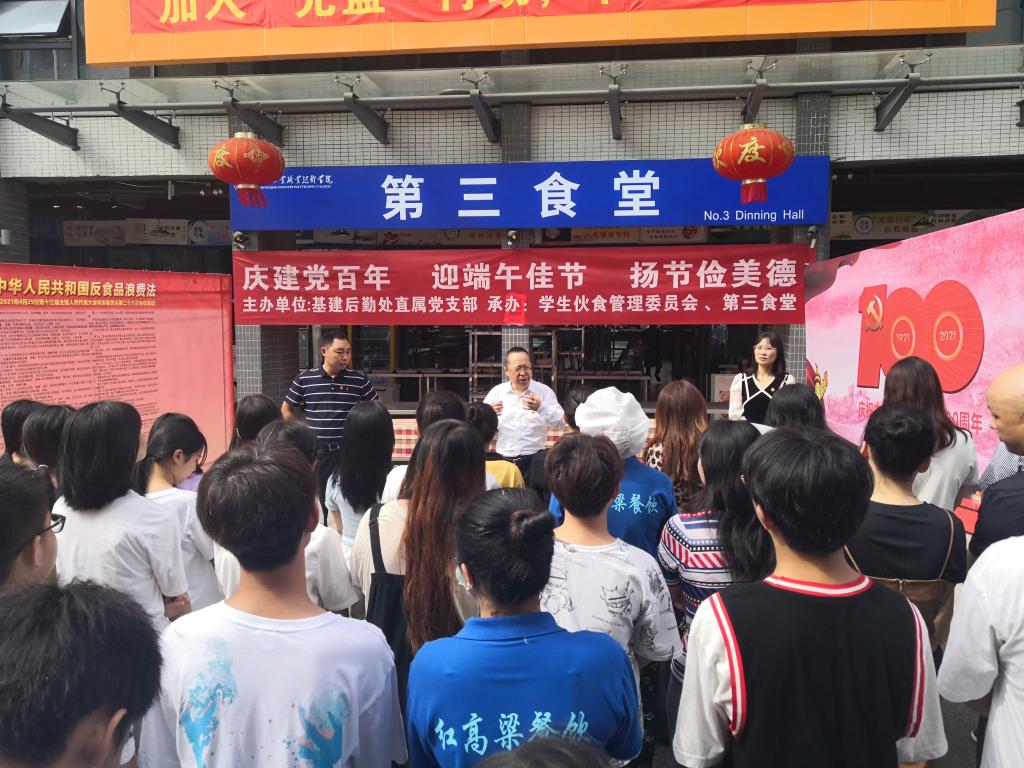 为庆祝中国共产党成立100周年和学校65周岁生日,迎接端午佳节,丰富师生们的校园文化生活,积极开展《中华人民共和国反食品浪费法》 (主席令第七十八号)宣传,学校基建后勤处党支部于端午佳节前在学生第三食堂开展了“庆建党百年、贺重工生日、迎端午佳节、扬节俭美德”主题活动。学校副院长徐兴旺出席活动,相关职能部门负责人、基建后勤处直属党支部委员、后勤党员群众、食堂员工、学生伙食管理委员会成员及各二级学院学生代表近百人参加了此次活动。活动开幕式由基建后勤处直属党支部书记朱兵主持。