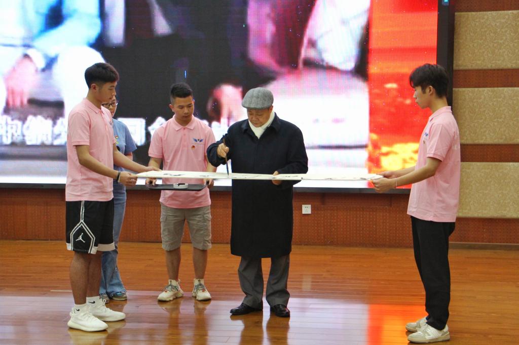 《春天的故事》旋律响起,陈家甫先生扮演的“邓小平同志”缓缓走进会场。他首先以极似邓小平同志的嗓音演绎了“南方谈话”,为大家再现了小平的风采,回顾了小平同志波澜壮阔的一生,并现场用邓体书法写下“发展才是硬道理”赠与我校师生。