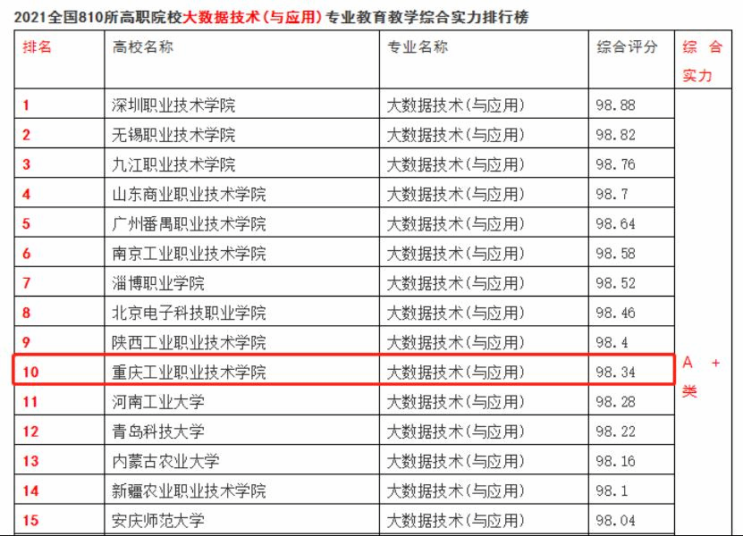 近日,全国高校大数据与人工智能推进联盟发布“2021全国高校大数据技术(与应用)专业教育教学综合实力排行榜”,我校人工智能与大数据学院大数据技术(与应用)专业在全国809所高职专科院校中获得第10名(A+类)的好成绩。