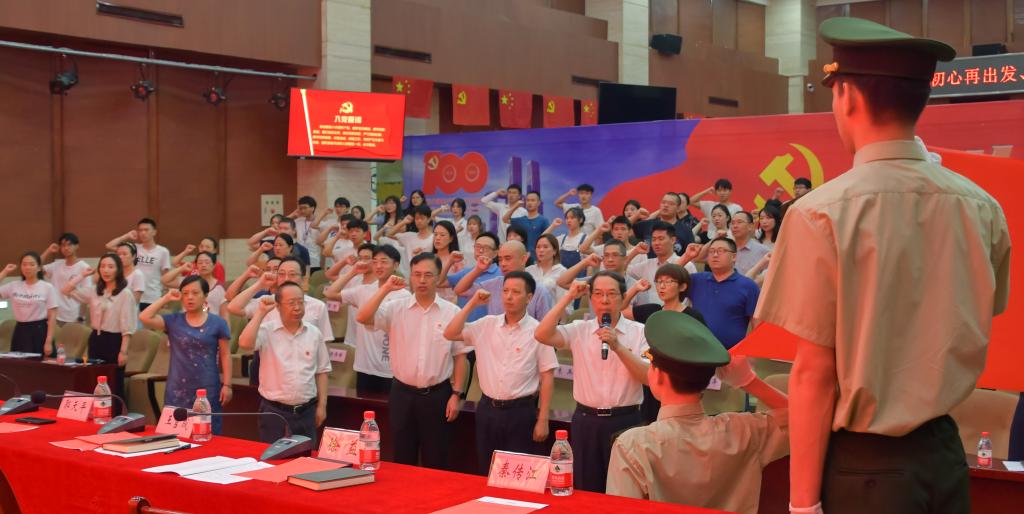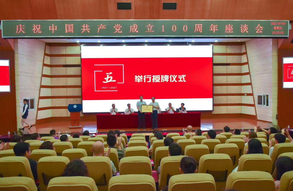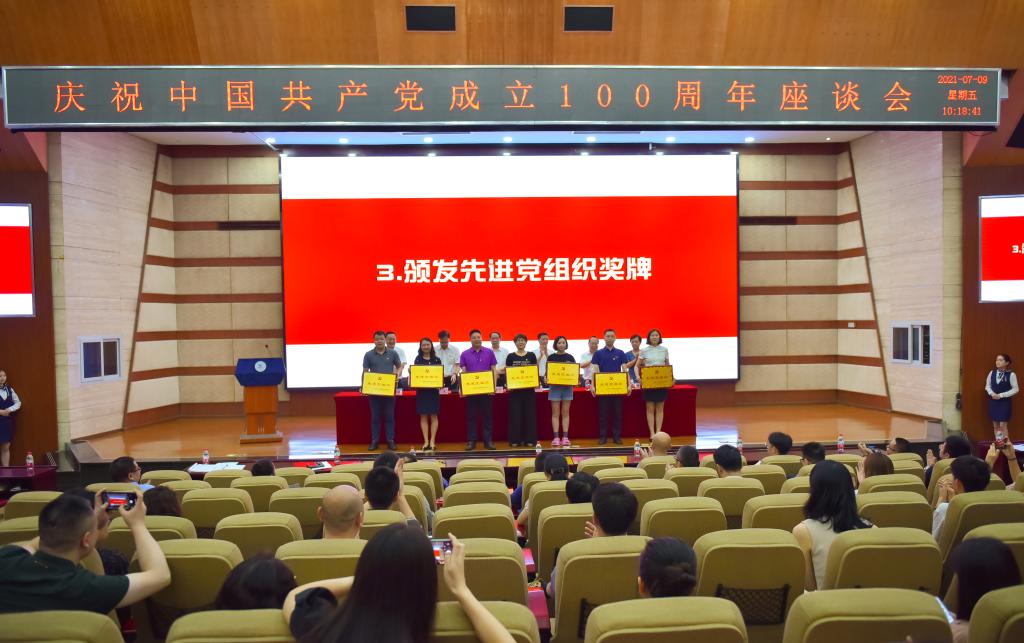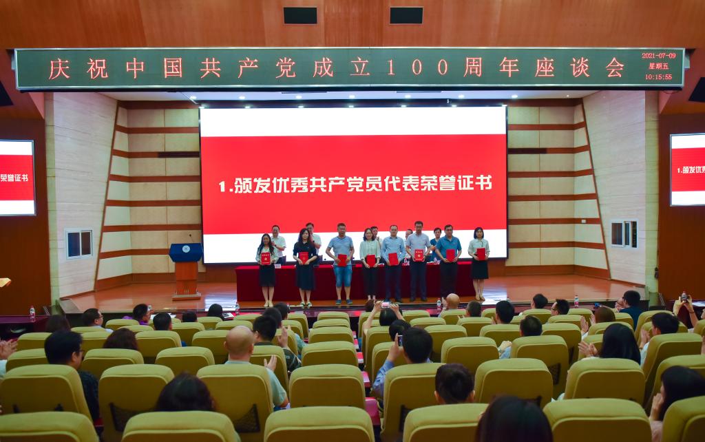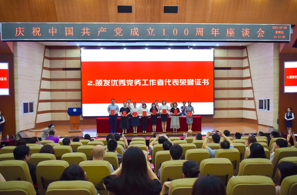 为认真学习贯彻习近平总书记在庆祝中国共产党成立100周年大会上的重要讲话精神,表彰先进典型,追忆峥嵘岁月,重温奋斗历程,动员全校共产党员和广大师生不忘初心、接续前行,为全面建成中国特色高水平高职学校而努力奋斗。7月9日,在学校第一学术报告厅举行了庆祝中国共产党成立100周年座谈会。全体党委委员,各党总支书记、直属党支部书记、离退休党支部书记代表,市以及市教育系统“两优一先”获得者,学校“两优一先”代表,老党员代表及新发展党员代表共百人参会。学校党委副书记、院长郭天平同志主持大会。