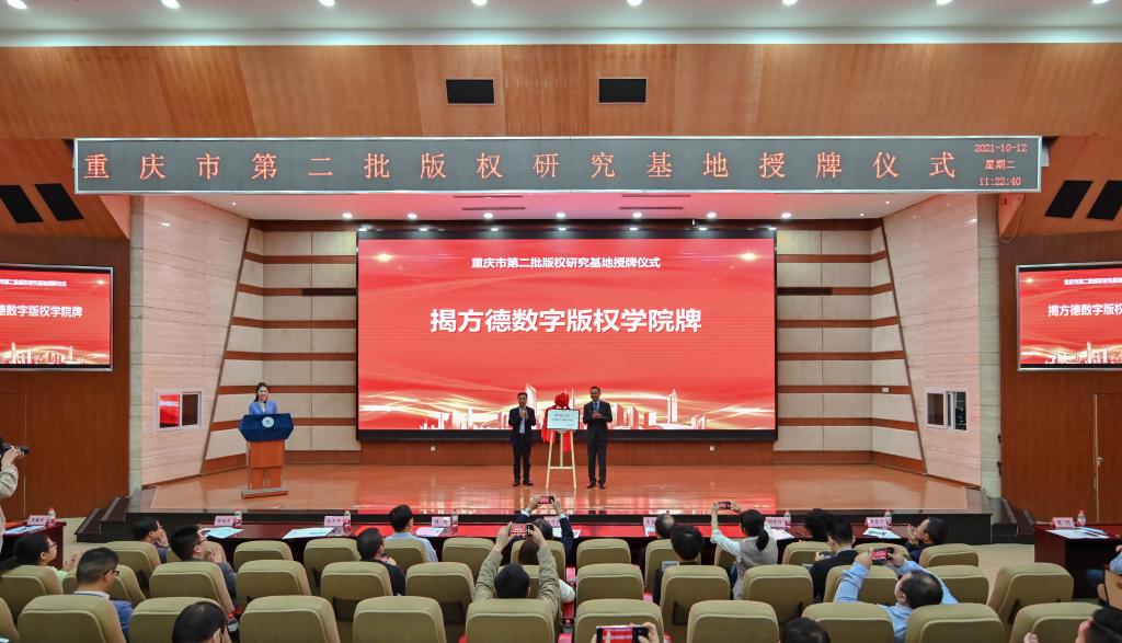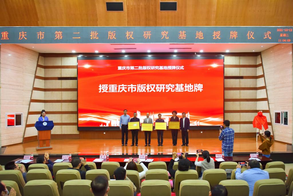 10月12日,重庆市第二批版权研究基地授牌仪式在我校举行。市委宣传部二级巡视员左图强,市教育委员会二级巡视员谯建,我校党委书记王官成、院长郭天平,重庆邮电大学,重庆工商大学,重庆文化艺术职业学院相关领导出席仪式,重庆邮电大学、重庆工商大学、重庆文化艺术职业学院及我校师生代表共计100余人参加仪式。