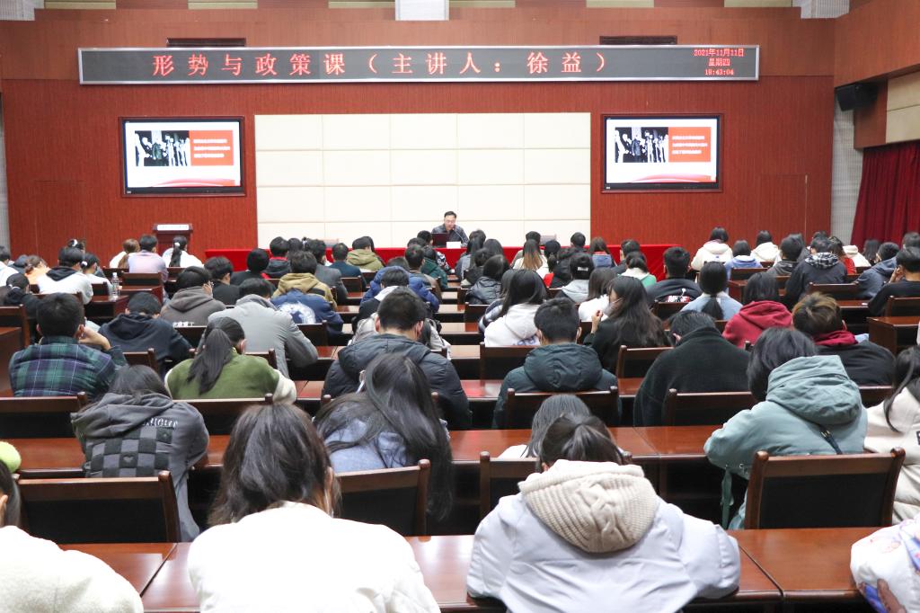 日前,学校党委副书记徐益在第二学术报告厅讲授题为“百年奋斗路,启航新征程”的形势政策课。电子与物联网工程学院、化学与制药工程学院师生代表共计150余人聆听讲授。