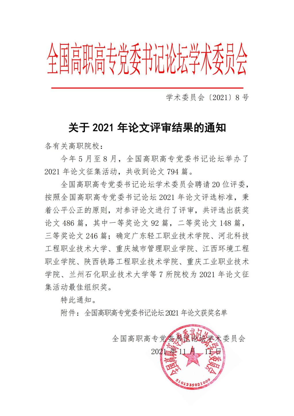 近日,全国高职高专党委书记论坛学术委员会公布了《关于2021 年论文评审结果的通知》。学校荣获2021年论文征集活动最佳组织奖,取得了一等奖4项、二等奖9项、三等奖14项的好成绩。