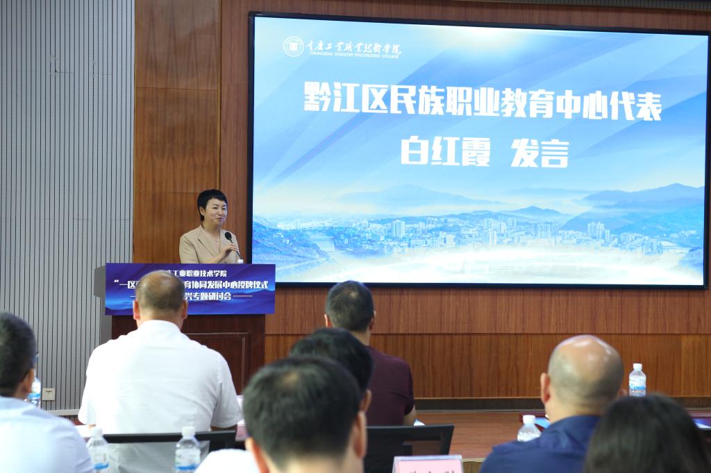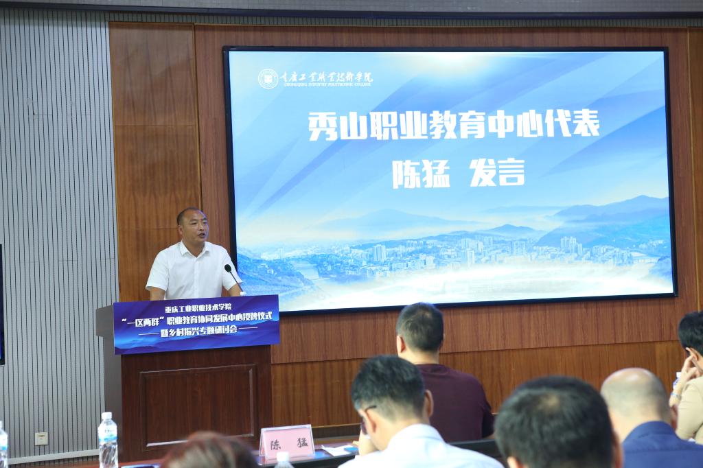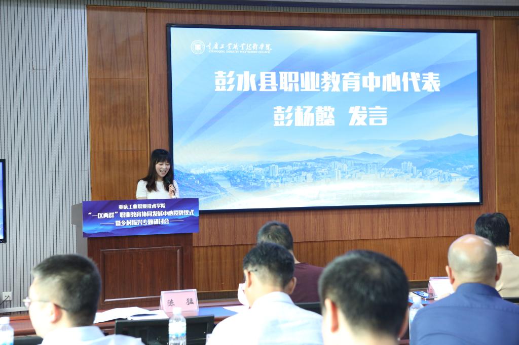 职业教育协同发展院校代表彭水县职业教育中心副校长陈家斌作题为“以帮扶支援,携手共赢促发展”的发言。他讲到,重庆工业职业技术学院与彭水职教中心签订的校际对口帮扶协议中,对帮扶学校的管理和师资水平、专业和课程建设、教学高质量建设等方面进行了一对一的帮扶指导。一是拓宽升学渠道,开展“3+2”合作办学;二是帮扶优质专业,共建共享资源;三是落实立德树人根本任务,建立课程思政教学研究分中心;四是提升双优质量,共同开展科研合作;五是打造师资队伍,培育技能大师名师。陈家斌副校长表示,通过重庆工业职业技术学院的精准结对帮扶,彭水职教中心将坚持“请进来”和“走出去”相结合,积极促进职教中心与重庆工业职业技术学院的专业人才与学生互动双向交流,培育更多区域需求人才,共同续写高质量发展的新篇章。