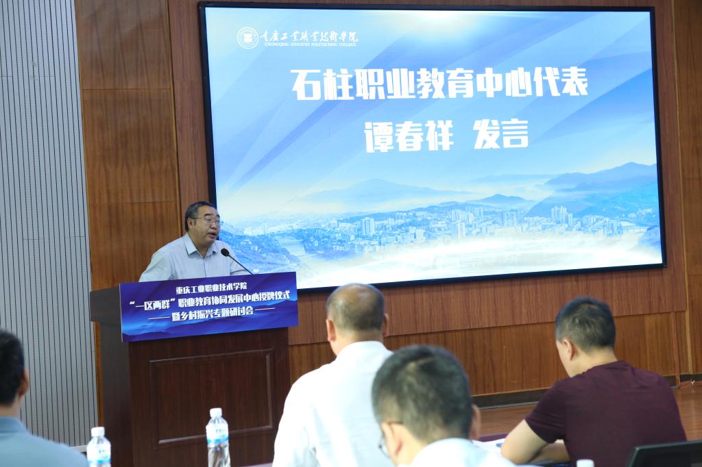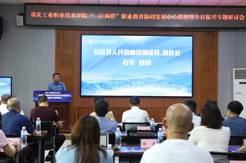 石柱县政府党组成员、副县长石华在授牌仪式上致辞。他围绕石柱县区域优势、特色产业、康养旅游、气候旅游、非物质文化遗产等方面详细介绍了石柱县县情。石华副县长进一步讲到,要坚持党的领导,坚持正确的办学方向,坚持立德树人,优化职业教育的类型定位,深化产教融合、校企合作,深入推进育人方式、办学模式、管理体制、保障机制的改革,稳步发展职业本科教育,建设一批高水平职业院校和专业,推动职普融合,增强职业教育的实践性,加快构建现代职业教育体系,培养更多高素质技术的技能人才、能工巧匠和大国工匠。他表示,为全面深入贯彻落实习近平总书记关于职业教育的重要指示要求和党中央关于推动成渝地区“双城经济圈”建设的重大决策部署,此次举行“一区两群”职业教育协同发展中心授牌仪式暨乡村振兴专题研讨会,就是落实今年年初签订的校地战略合作协议,落实教育优先发展战略,深入贯彻实施乡村振兴战略,深化校地协同创新,多方面多领域开展的战略合作,充分发挥“一区”对“两群”的辐射带动作用,强化产业协同、城乡协同、创新协同、改革协同,加快构建“一区两群”协调发展格局,着力解决就业和教育问题,不遗余力地培养实用型、应用型技术技能人才,促进农村劳动力就业转移,推动巩固拓展脱贫攻坚成果同乡村振兴的有效衔接。