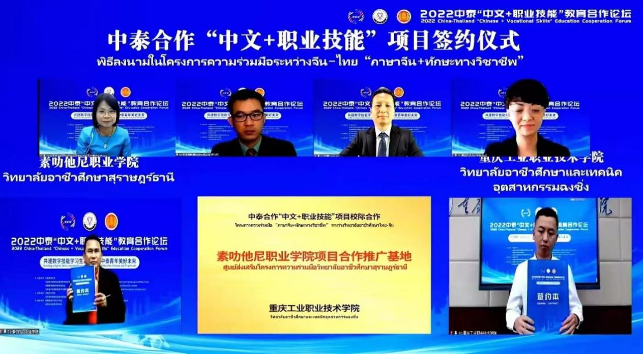 开幕式上,学校与泰国素叻他尼职业学院举行了线上签约仪式,学校荣获中泰合作“中文+职业技能”项目示范校。中泰合作“中文+职业技能”项目是贯彻落实“一带一路”电商谷产教融合国际合作项目的实践探索,项目立足于中国电子商务职业教育近20年的实践成果,将中文学习与电子商务技能培训相结合,通过构建集标准研制、课程建设、师资培训、职业技能培训与认证、竞赛交流、创新创业于一体的国际化数字技能人才培养发展体系,深化中泰双边职业教育合作。双方将以“共商、共建、共享”为原则,共同促进中泰合作“中文+职业技能”项目的落地、实施和推广工作,共享数字经济发展成果。
