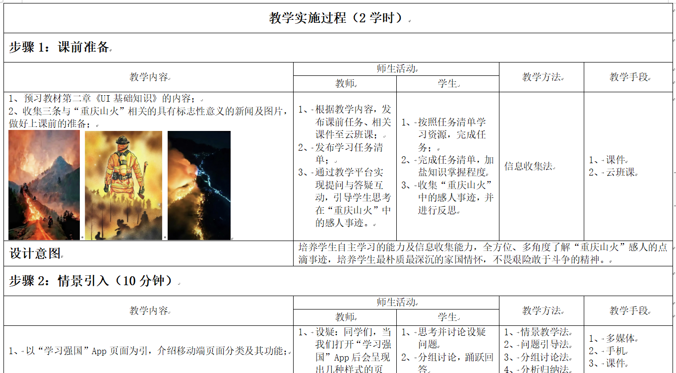 《移动UI设计》课程教师何洁围绕UI设计课程内容,挖掘课程思政与艺术形式合理契合的要素,将“防火长城”、山火“逆行者”、“家国观”、“爱在山野”公益行动等思政元素融入课堂,引领学生探索故事背后的精神,构筑学生的家国情怀、生态意识和志愿精神。