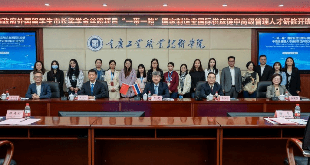 11月4日,“一带一路”国家制造业国际供应链中高级管理人才研修班在我校正式开班。市教委国际处处长李斌,市外事办亚洲处处长徐胜,新雅国际集团董事长陈安庆及集团相关领导,学校副院长秦传江及二级学院学院负责人,我市二十余所高职院校骨干教师代表和四十九位泰方学员,通过线上线下相结合的方式共同参加了开班仪式。线下开班仪式在办公楼3楼会议室召开。