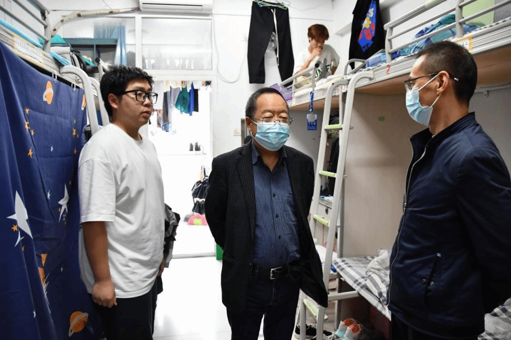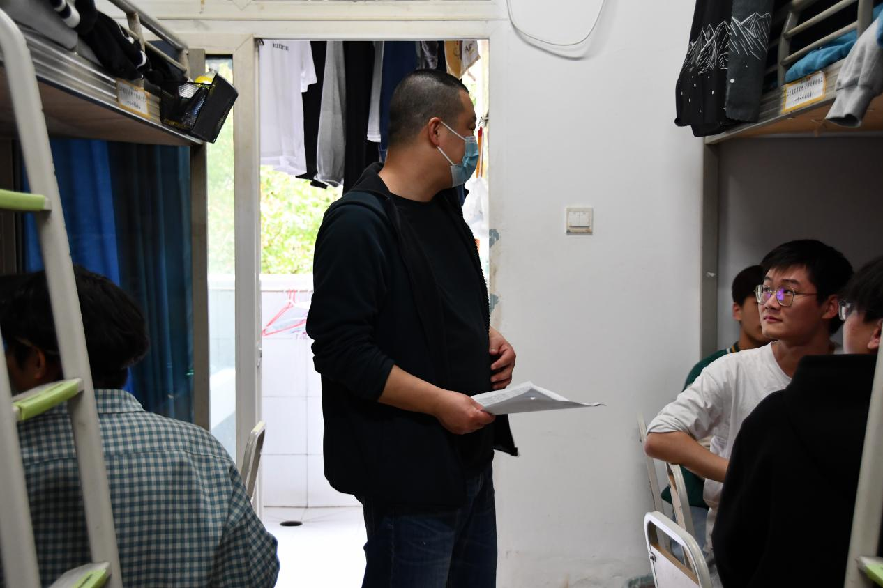 在学院联系校领导、学校党委委员、副院长徐兴旺的带领下,学院党总支书记黄勇以及留校备勤的全体辅导员深入学生宿舍,检查宿舍安全卫生状况,了解学生线上学习及日常生活情况,密切关注学生的思想状况及心理健康,倾听学生反映的问题和提出的意见与建议,对学生开展疫情防控主题谈话教育。