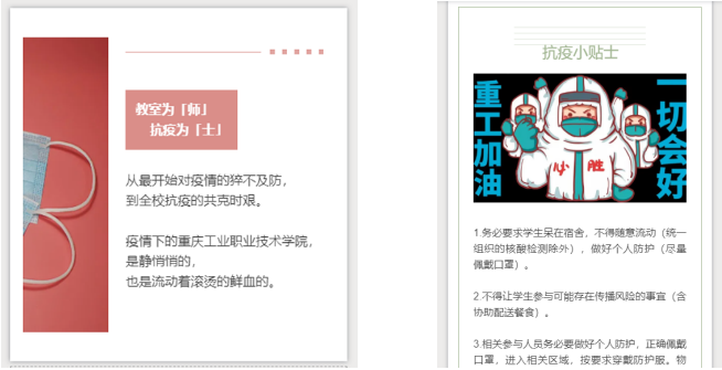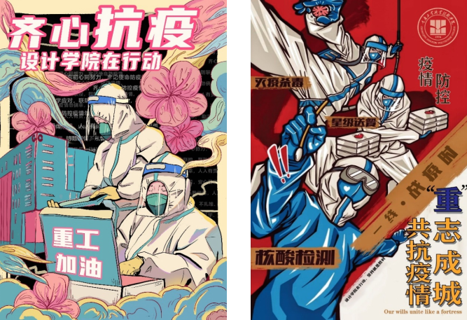在学校紧张的防疫工作期间,“疫情防控”题材成为设计创作的素材库,是课程思政的活教材。学校设计学院在线上教学中创新教学方式,从专业特色和课程特点出发,提取全民战“疫”中的内涵和精髓,精心设计教学环节,将疫情防控中生动、鲜活、彰显重工人精神品格的典型案例有机融入课程教学内容,创新开设了一堂《“疫”线教学》专业课。