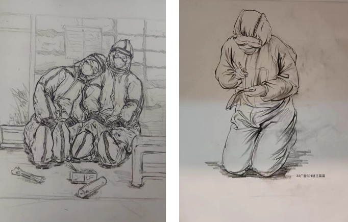 在张文老师的《数字绘画》课堂上,同学们拿起画笔,用线条和色彩勾勒出对医护人员的感激之情。