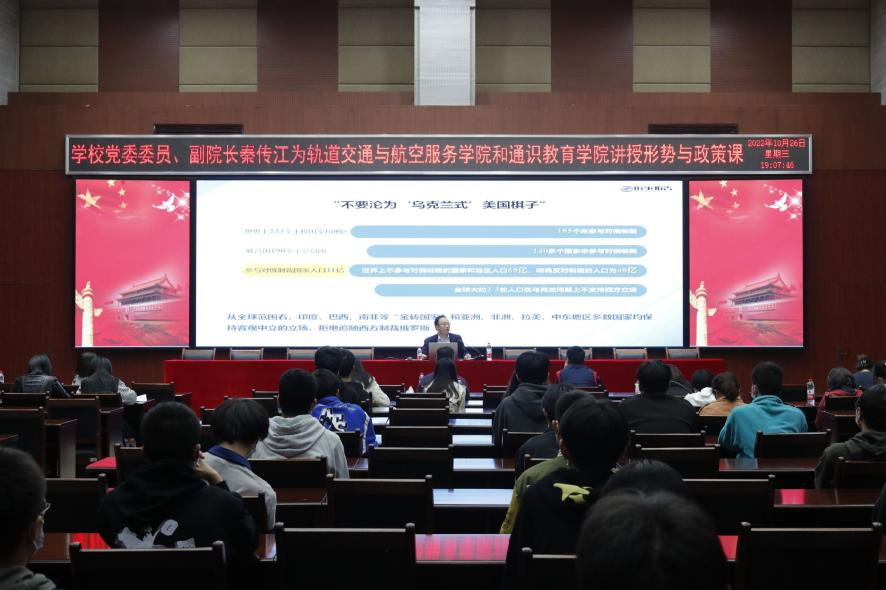日前,学校党委委员、副院长秦传江在学校第二学术报告厅为轨道交通与航空服务学院师生讲授了题为“乌克兰危机演变及影响”的形势与政策课。轨道交通与航空服务学院师生代表共计70余人聆听讲授。
