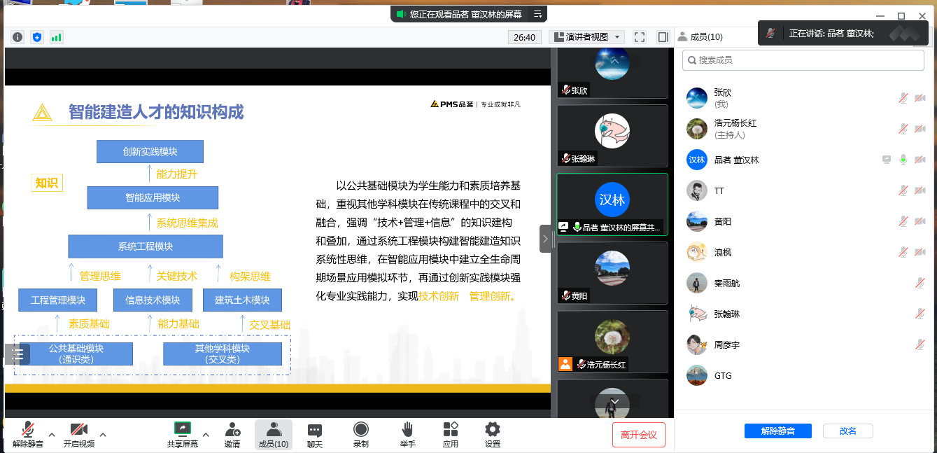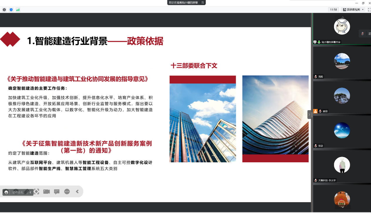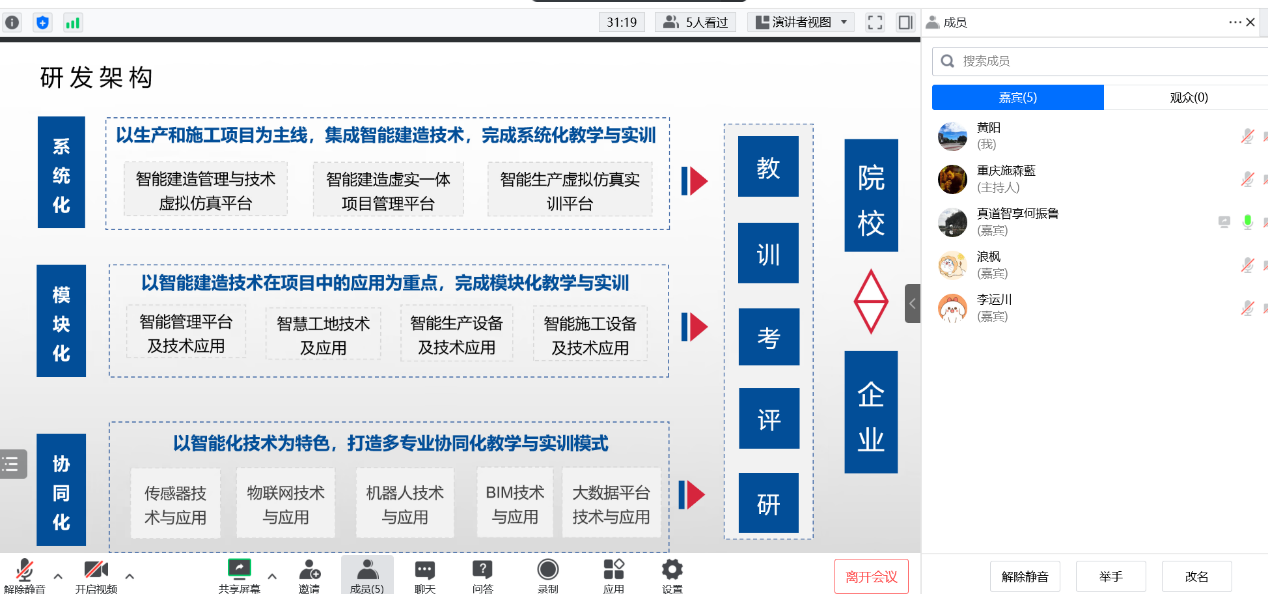 广联达科技股份有限公司重庆分公司区域经理魏然和数字高校中心经理宋蕊介绍了校企合作方向和方式,以及广联达在智能建造技术专业升级、人才培养和课程体系等方面的建树;品茗科技股份有限公司教育事业部经理董汉林和重庆浩元软件有限公司院校合作事业部经理杨长红介绍了建筑业数字化转型、智能建造人才培养体系及相关实训条件建设的行业现状;山东大学教授陆小珊围绕什么是智能建造、智能建造专业知识和技能、智能建造岗位能力培养等分享了研究所得;山东新之筑信息科技有限公司市场总监刘德亮、重庆天魅信息科技有限公司总经理唐田、杭州丰坦机器人有限公司营销总监张可通过视频连线对所属公司实景和产品实物进行了展示,在观看了建筑喷涂机器人的工作过程后,学院教师对机器人的传统观念有了进一步的实体感受;武汉真道智享科技有限公司副总经理何振鲁等企业专家就智能建造专业建设和相关实训室搭建工作与我校教师进行了深入交流。