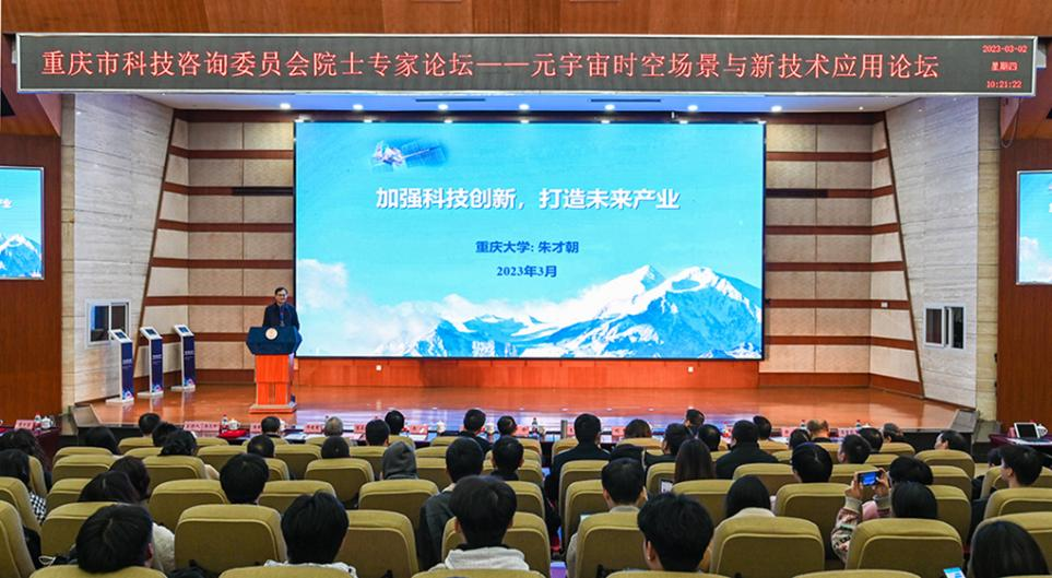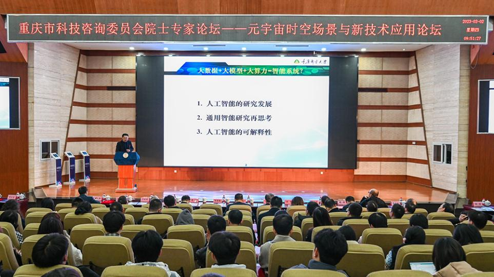 3月2日,重庆市科技咨询委员会院士专家论坛——元宇宙时空场景与新技术应用论坛在重庆工业职业技术学院举办。重庆市科技局战略法规处处长廖明,市教委科技处处长刘畅,四川外国语大学党委书记邹渝,重庆邮电大学党委常委、副校长王国胤,重庆大学校长助理、重庆大学科学技术发展研究院院长、前沿交叉学科研究院院长朱才朝,国家督学、市高等职业技术教育研究会会长张亚杭,市重点产业人力资源集团有限公司董事长周泽,我校党委书记王官成,党委副书记、院长郭天平,副院长秦传江以及来自政校行企多方的专家学者、高校领导、行业代表等共计300余人出席论坛。本次论坛聚焦元宇宙产业发展、新技术融合应用、人工智能、科教融汇、数字产业人才培养等议题,设立了“线上活动”和直播平台。论坛分为两个阶段,第一阶段由郭天平院长主持,第二阶段由袁苗达处长主持。