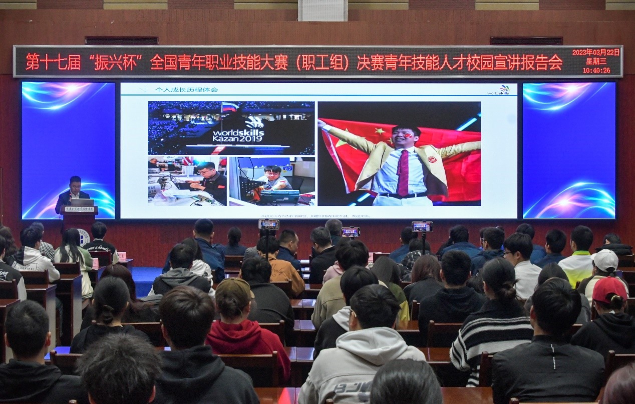 为深入学习贯彻习近平总书记关于青年工作的重要思想和关于人才工作的重要论述,努力引导广大青年走技能成才、技能报国之路,3月22日,第十七届“振兴杯”全国青年职业技能大赛(职业组)决赛青年技能人才校园宣讲会在学校第二学术报告厅举行。宣讲会邀请了全国技术能手、“中华人民共和国第一届职业技能大赛”时装技术项目(国赛精选)“金牌”、重庆市工贸高级技工学校正高级实习指导教师谢玲莉,第45届世界技能大赛“电子技术项目”金牌获得者、重庆铁路运输技师学院教师梁攀担任主讲,部分参赛选手以及学生代表等150余人聆听会议。会议采取线上线下相结合的方式进行,会议由学校学生会李蕴浙主持。