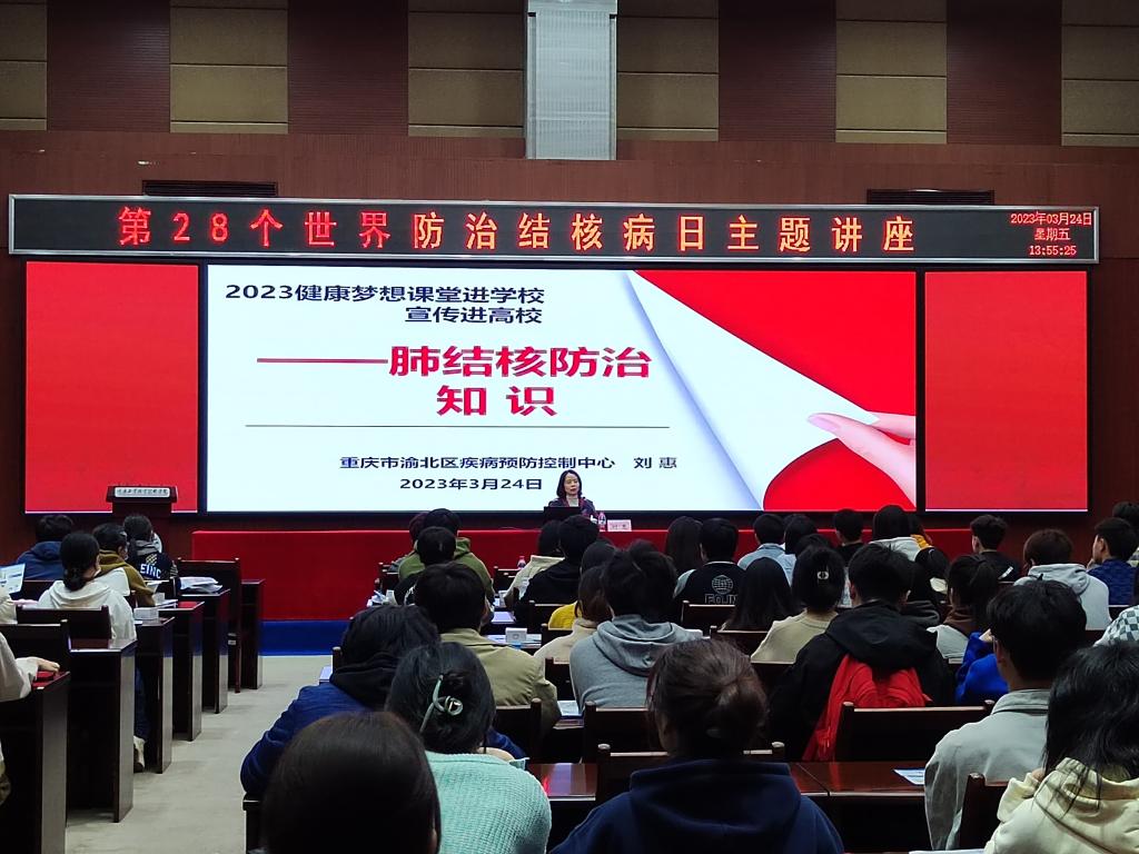 日前,在第28个世界防治结核病日来临之际,为广泛宣传结核病防治知识,提高全校师生对结核病的知晓率与防病意识,减少结核病传播,学校基建后勤处组织开展了“你我共同努力 终结结核流行”主题宣讲活动,活动采取线上线下相结合的方式开展。组织同学们线上关注市结核病防治所微信公众号,学习了解肺结核的相关知识并参加线上答题;在校园里张贴宣传海报,制作结核病防治知识宣传展板,向师生发放结核病知识手册,邀请渝北区疾控中心刘惠科长到校开展结核防治知识讲座,为师生们普及现代结核病防治策略,结核病防治相关知识及国家结核病防治免费政策。