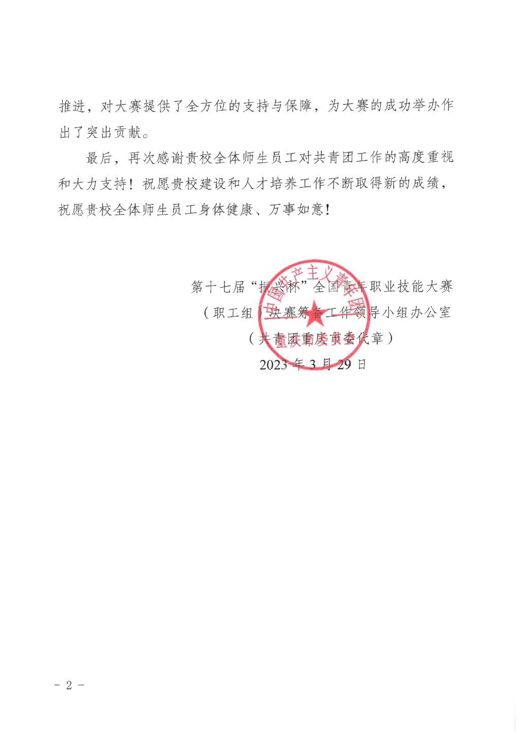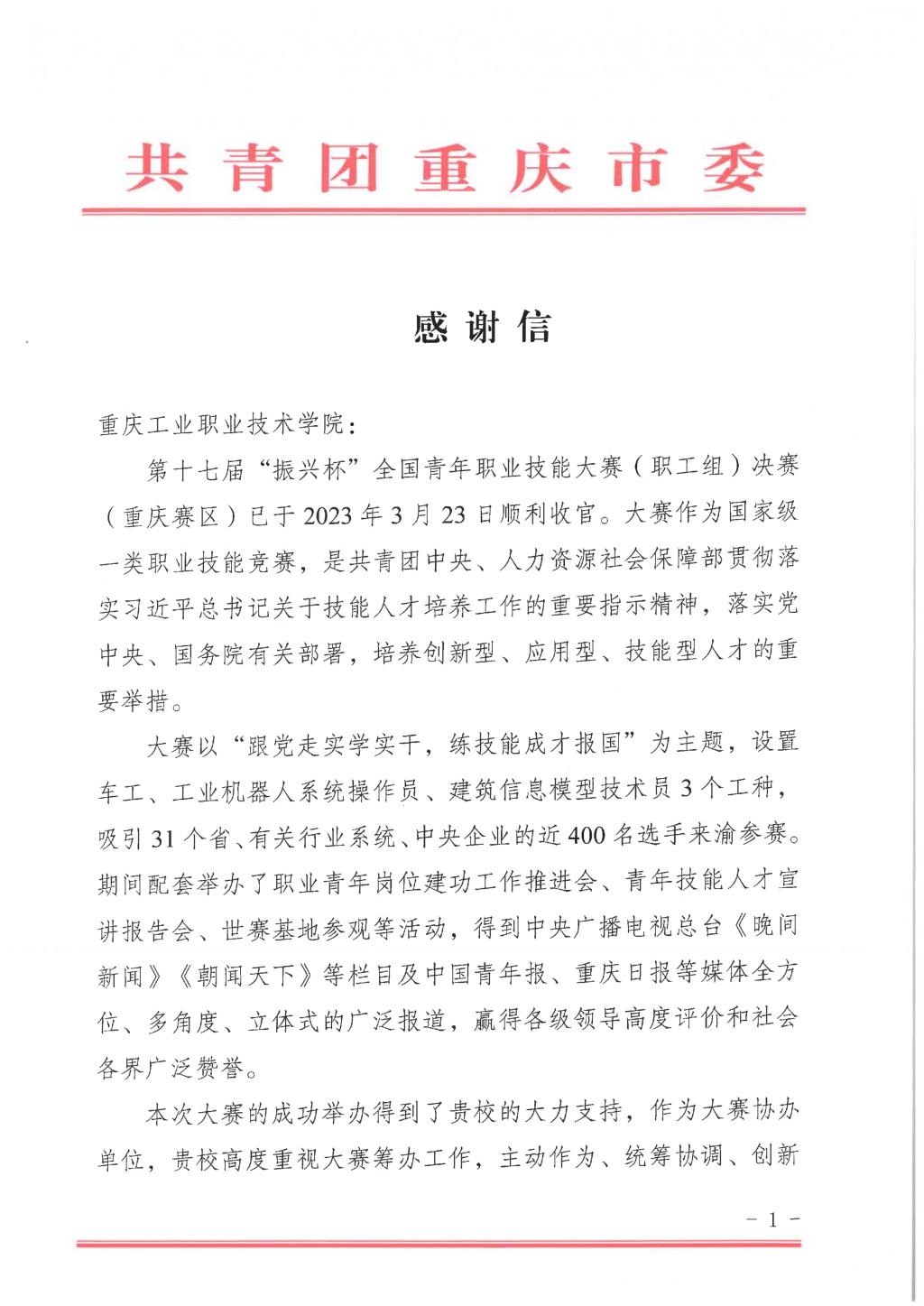 【综合新闻】学校收到共青团重庆市委发来的感谢信
