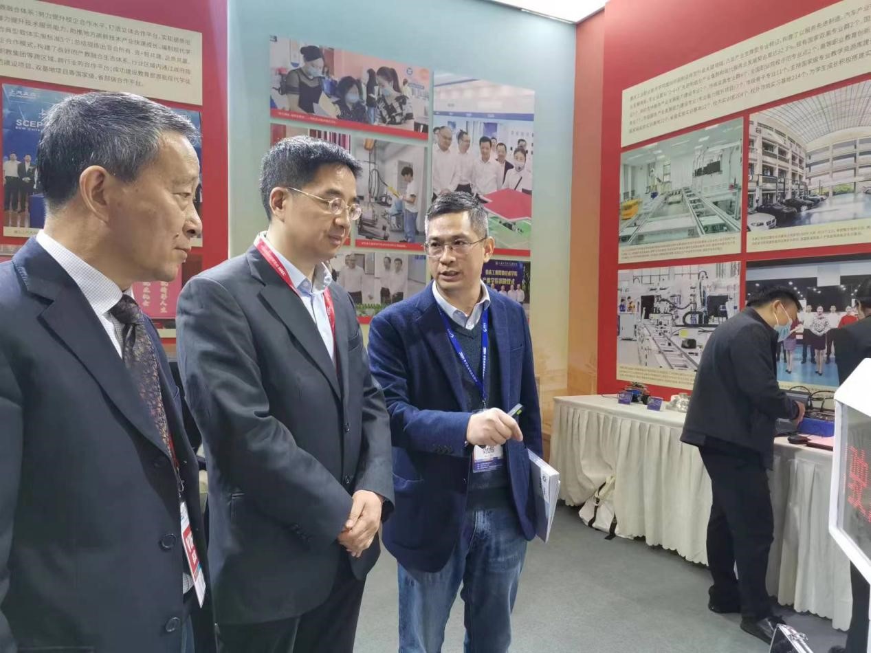 展会期间,重庆市委教育工委书记、市教育委员会主任刘宴兵莅临学校展区,听取了学校在二冲程发动机、智能物流车、有毒废水智能脱毒一体机、文创产品以及电子信息产品研发等方面的情况。他对学校高端技术技能人才和高层次技术技能人才培养方面给予了充分肯定。刘宴兵表示,学校是重庆市高端制造人才培养不可缺少的重要支撑,学校今后应加强产品研发和推广的力度,注重师生科技创新和创新创业。