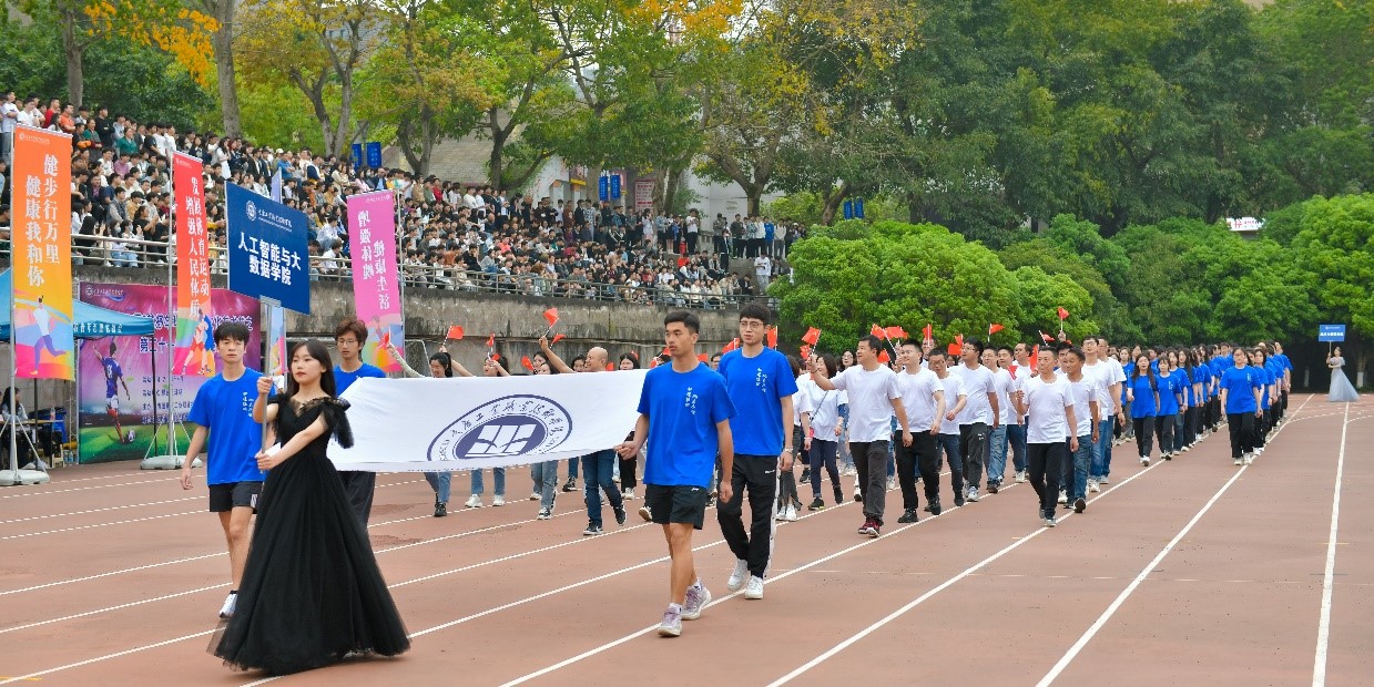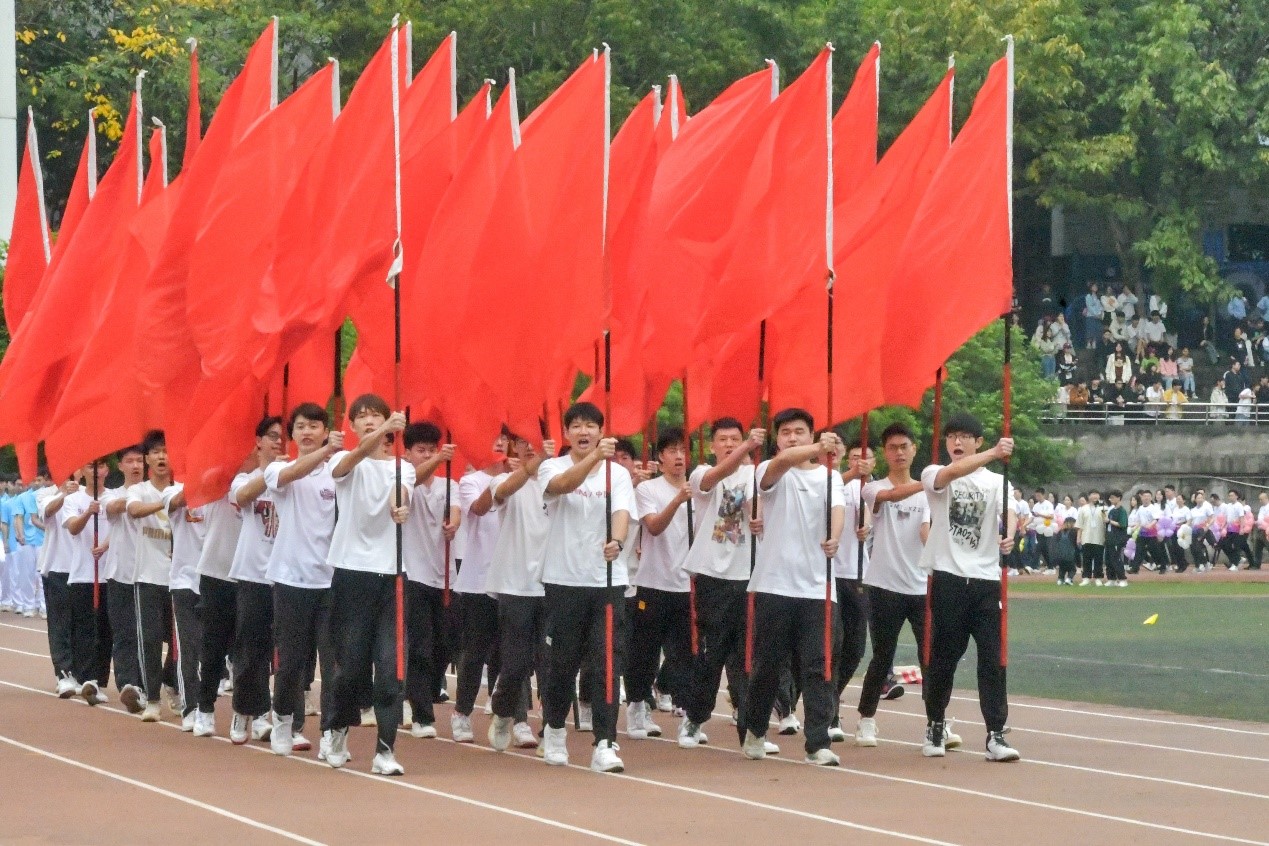 伴随着激昂的进行曲,执旗手迈着矫健整齐的步伐,高举着鲜艳的五星红旗步入会场。紧随其后的是校旗队、标语队、鲜花队、红旗队,裁判员方队、各二级学院教师及运动员方队、各分工会方队依次入场,精神抖擞地走过主席台。