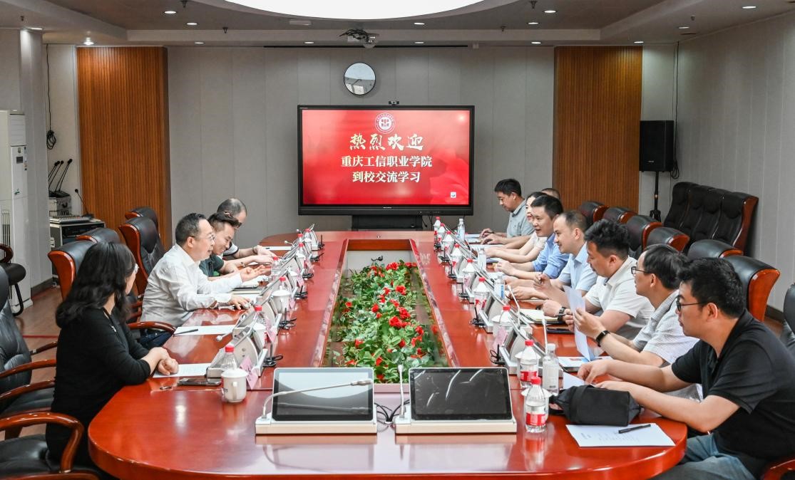 日前,重庆工信职业学院副院长阮仁全,后勤基建处长潘俊,学生工作部长黄晓强,现代教育技术中心主任刘辉元一行8人到校调研,学校党委委员、副院长徐兴旺以及相关职能部门负责人热情接待了调研组一行,并在办公楼六楼会议室召开座谈会。会议由徐兴旺副院长主持。