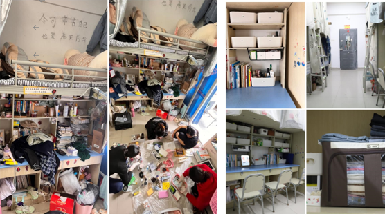培训师们以我校不同配置的宿舍为样板间,通过现场示范、互动讲解的方式,详细介绍了书桌、衣柜以及各类衣物的折叠方式和挂放技巧,并跟同学们分享了学会收纳整理将给同学们学习和生活带来的益处。同学们看到整理前后的空间变化,不禁感慨不同的生活用品竟有不同收纳方法,原来整理收纳这么有学问!