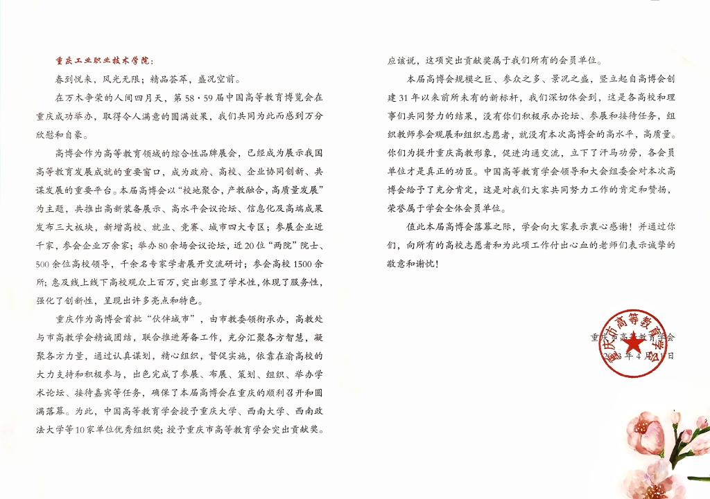【综合新闻】学校收到重庆市高等教育学会发来的感谢信