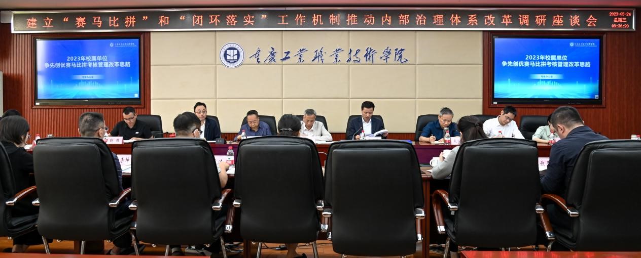 为深化落实学校《2023年度校属单位全面从严治党和事业发展绩效目标考核实施办法》文件精神,日前,学校在办公楼3楼会议室召开关于建立“赛马比拼”和“闭环落实”工作机制推动内部治理体系改革调研座谈会。市委巡回指导十五组副组长、重庆理工大学党委常委、副校长曾宪军,市委巡回指导十五组组员、市委党校(重庆行政学院)机关党委(纪委)副书记赵雄,市委巡回指导十五组组员、市委组织部人才发展中心干部田耘,学校党委书记郭天平,党委委员、副院长徐兴旺、赵柏森、秦传江,党委委员、纪委书记、监察专员颜正以及学校党政办公室、党委组织部、党委宣传部负责人,有关职能部门以及各个二级学院教师代表参加座谈会。会议由学校党委书记郭天平主持。