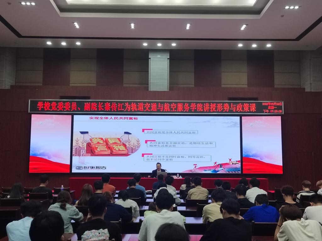 日前,学校党委委员、副院长秦传江在学校第二学术报告厅为分管部门和轨道交通与航空服务学院、通识教育学院师生讲授题为“走好中国式现代化之路”的形势与政策课,师生代表共计110余人聆听讲授。