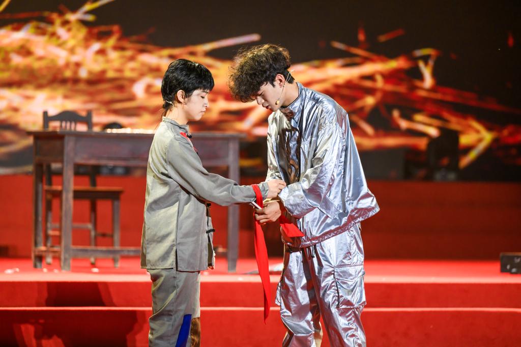 在情景朗诵《再读红岩》中,朗读者们以饱含深情的声音,穿透岁月厚重,重现江姐的绣针、许云峰的镣铐、小萝卜头的眼神等红岩精神意象,带领师生触摸共产党人钢铁脊梁,开启历史回溯之旅。舞蹈《绣红旗》灵动上演,演员们用细腻动作,还原白公馆里绣红旗的动人场景,将对党的忠心、对新中国的憧憬,融入每一次托举、每一步辗转,让信仰的具象化表达直击心灵 。原创话剧《梦里》创新搭建时空对话桥梁,让新时代少年与革命先烈跨时空交流,在青春视角与历史厚重的碰撞中,诠释红岩精神传承的永恒命题,引发“新时代如何践行红岩精神”的深度思考。